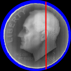 I scanned a dime and it took all night for the above code to get the job done. The blue in the image of the dime are places where the probe did not contact anything before the end of the probe run. The grey is, of course the dime. The red is where it was triggered at the start of the probe run. I think a bug got stuck under the probe (I was sleeping when it happened).