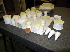 Here are a few pictures I took of things I have printed with my first extruder. They were mostly just experimental shapes but I did manage to sell three of them. The picture with just three things are the three I sold. Sorry some of the pictures are upside down. I was putting "resist" on the bottoms. Apparently, when I glaze them the glaze came flow down the side and then stick to the bottom of the kiln. I have painted the glaze on about half and I hope to get the rest done this week.